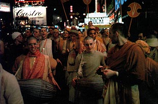 洛杉矶庙宇的奉献者们在好莱坞西街的节日活动中举行了狂喜的齐颂圣名。有十万多人参加了这次活动,大街小巷人潮如涌。人们身着节日盛装,载歌载舞,在欢快、狂喜的热烈气氛中齐声高唱主的圣名。许多旁观者拿着奉献者给的圣名卡试着与奉献者们一起唱颂。到处充满了欢歌笑语。活动从晚七点一直持续到十一点。许多第一次参加齐颂圣名运动的人们表示,要彻夜唱颂圣名。