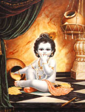 奎师那摇着头、皱着眉说:“我饿了,我要喝奶。”祂想爬到雅首达妈妈的腿上,但是她仍在继续搅拌着酸奶。于是,奎师那抓住搅拌棍,好象在说:“当至尊目标接近你的时候,不必要再继续做这个工作了。”然后主奎师那抓住母亲雅首达胸部的衣服,把一只脚撑在酸奶罐上,爬到她的腿上。雅首达的心顿时被融化了,乳汁如泉水般涌出。她用左臂抱着孩子,解开衣服,给奎师那喂奶。她怀着爱心微笑着,心满意足地看着奎师那。