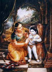 她看见奎师那盘着腿坐在一个扣着的臼上,用黄油喂着猴子。她注意到,祂从眼角仔细观察着,期待她去干预。祂通过这种方法教导人们,即使至尊主,当祂犯错误的时候也会害怕。雅首达找了一根棍子,悄悄去抓奎师那。当祂看见她怀着从未见到过的愤怒拿着棍子接近时,祂一次又一次地非常惊恐地看着她。祂马上明白了,祂会有麻烦。祂虽然慈爱地给猴子们喂黄油,但这并不能使祂逃避愤怒的母亲的惩罚。在梵文中,臼被称为ulu-khala。Khala的意思是流氓。雅首达母亲认为,她可以原谅儿子打破研臼的过失,但无法容忍祂与一个khala或流氓联谊,因为近朱者赤,近墨者黑。